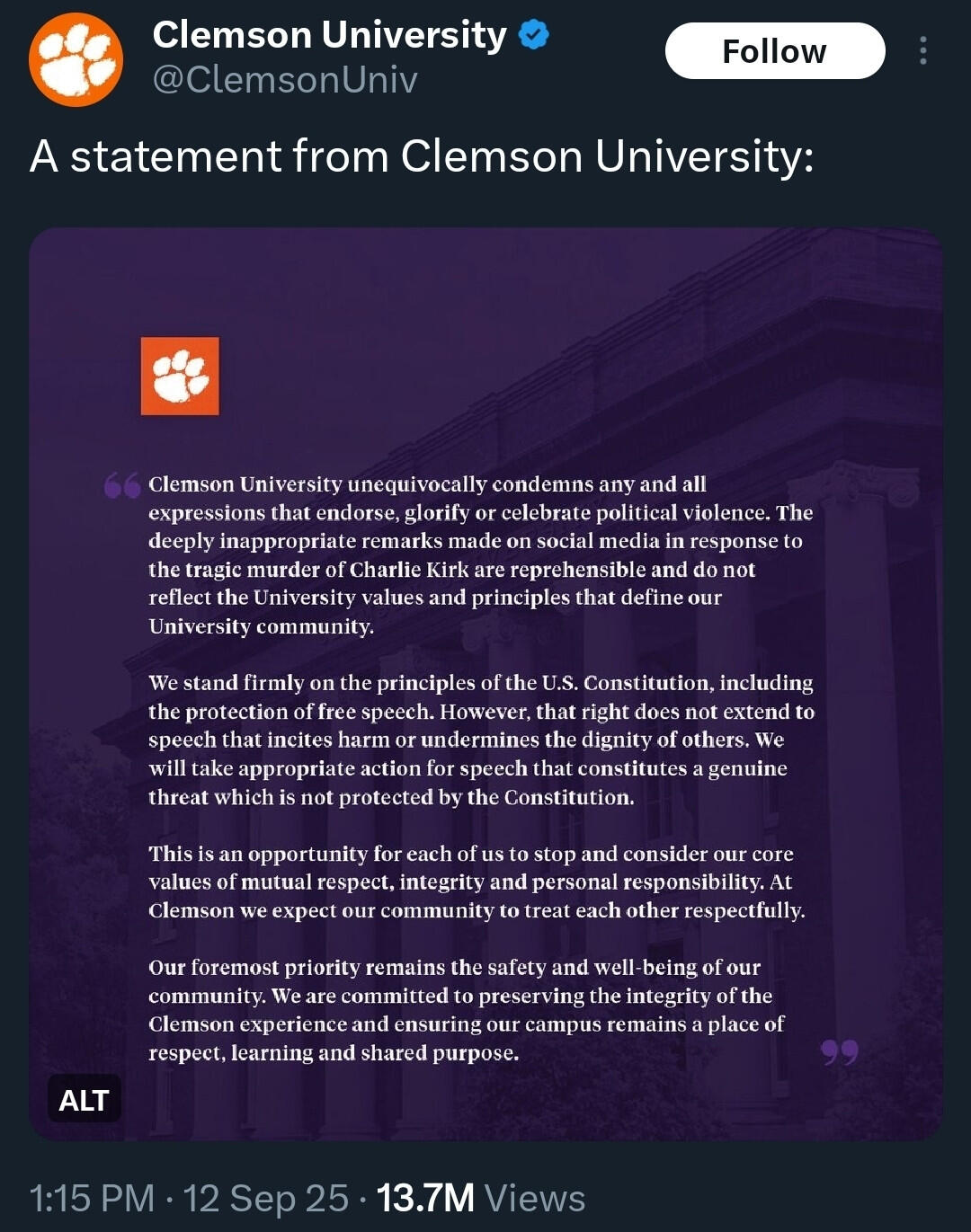 Clemson fires employee for Kirk posts. Two more removed from teaching duties